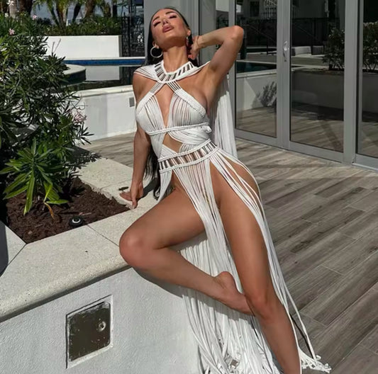 Jiarl long fringe halter dress