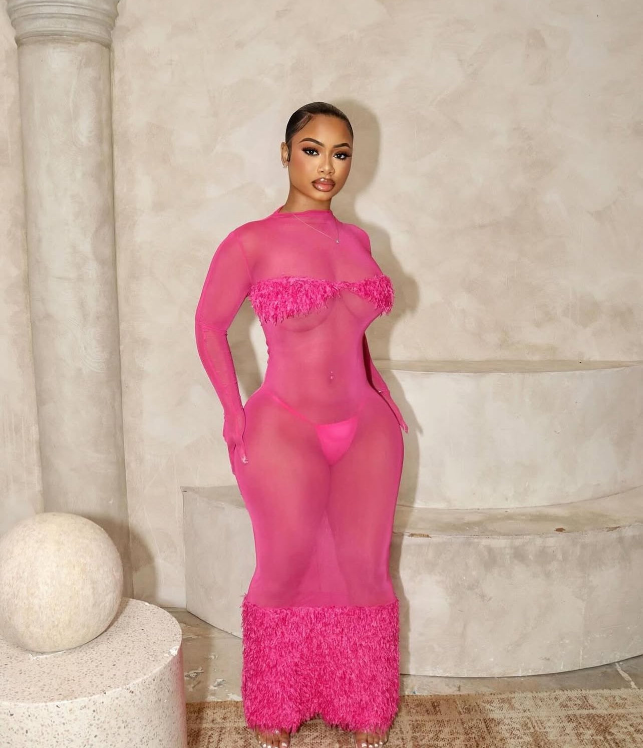 - Product design/details: long sleeve ruffled frizz bust detail long sheer coverup maxi dress