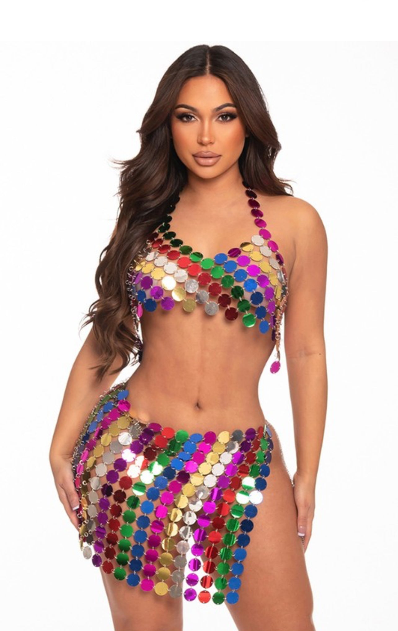 - Product design/details: sleeveless halter back multi-discs all over chain metallic skirt set