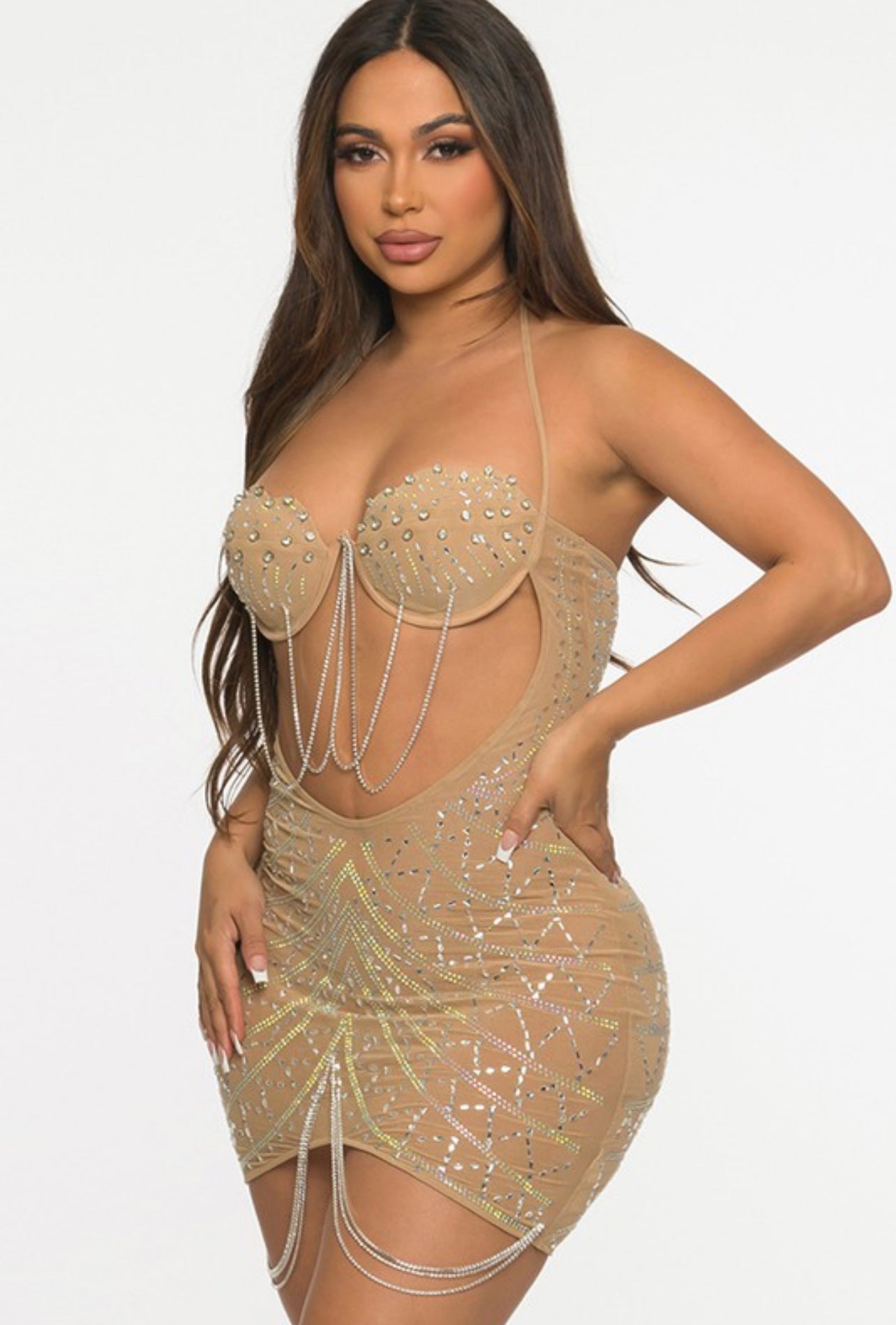 - Product design/details: sleeveless rhinestones all over with chains dangling detail back cut out mini dress