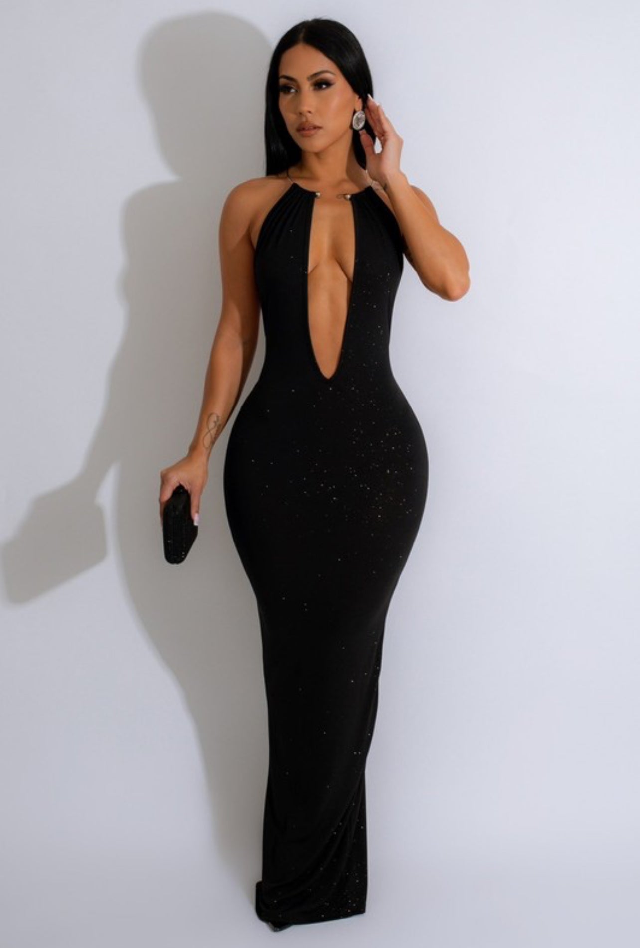 - Product design/details: sleeveless neck crown metal piece detail deep v bust long dress
