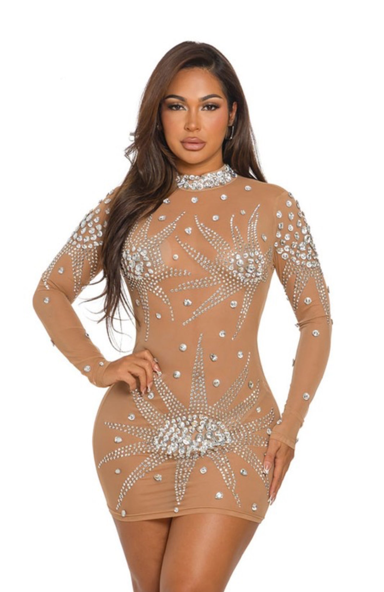 - Product design/details: long sleeve open back mini dress with silver rhinestones