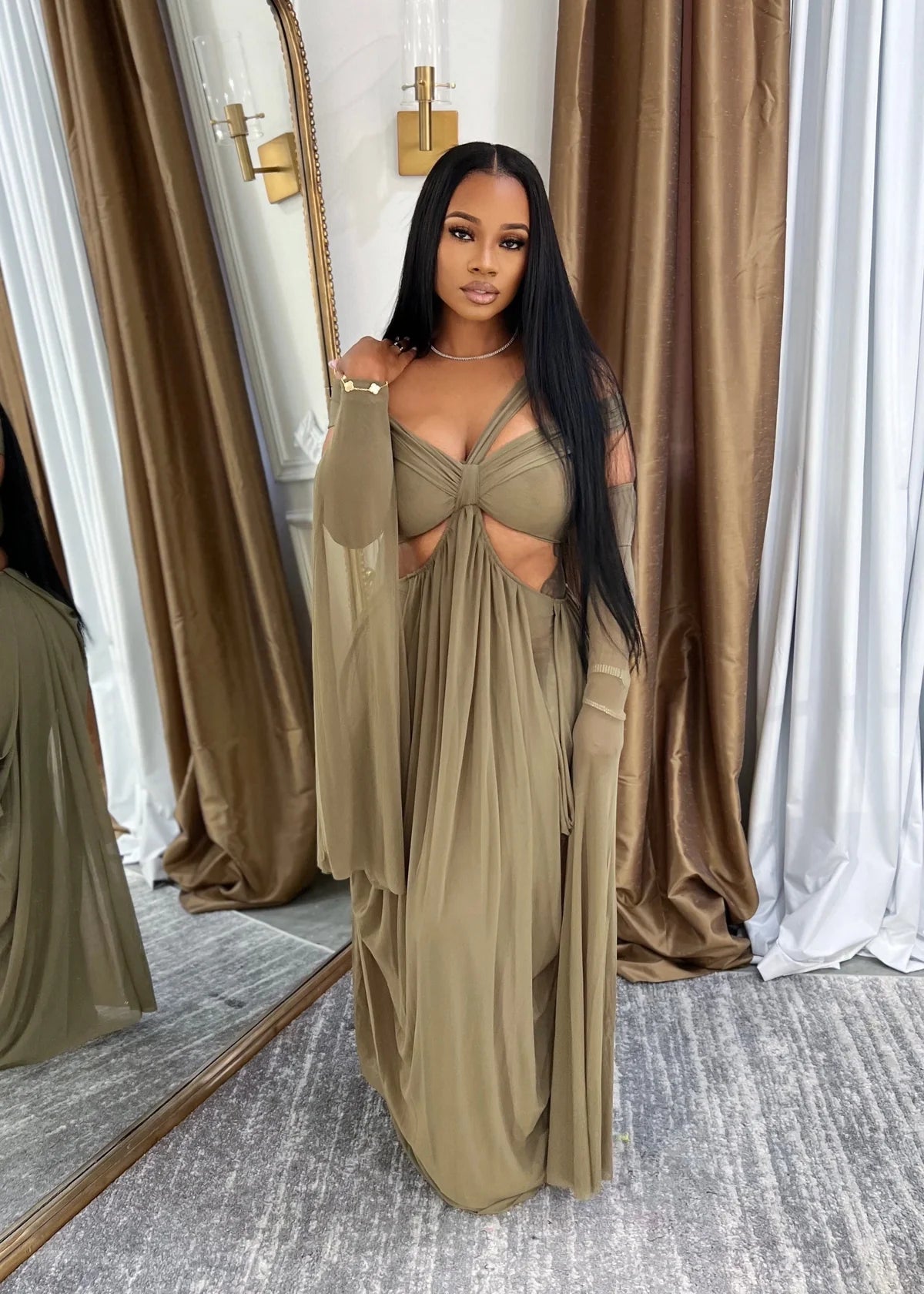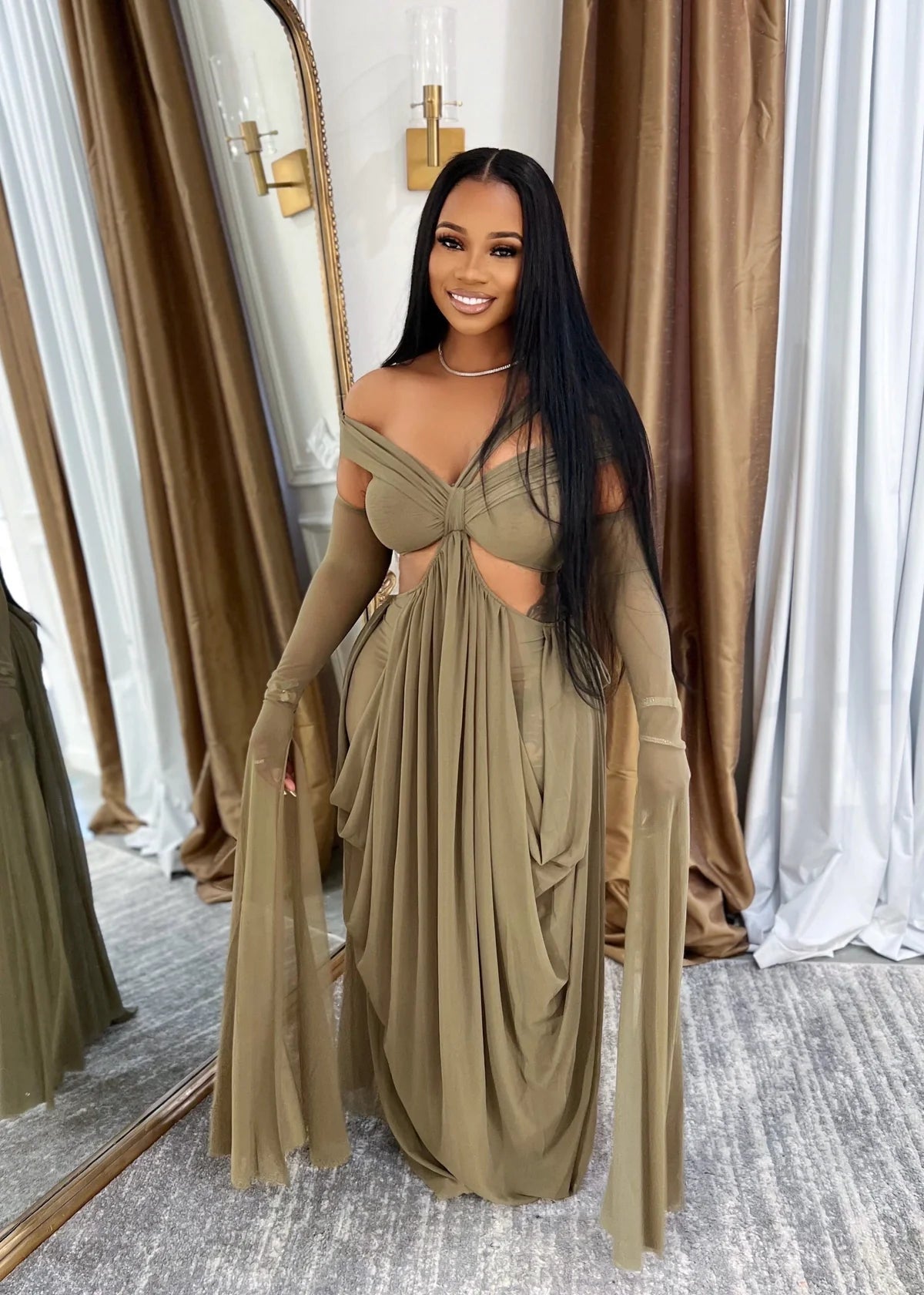 - Product design/details: long sleeve ultra sheer drapes style oversized chiffon off shoulder side cutout extended sleeves multi-folds maxi dress