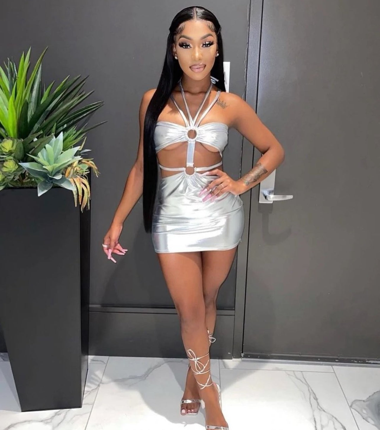 - Product design/details: multi spaghetti strap wrap mid rings mid cutout metallic style trendy faux leather mini dress
