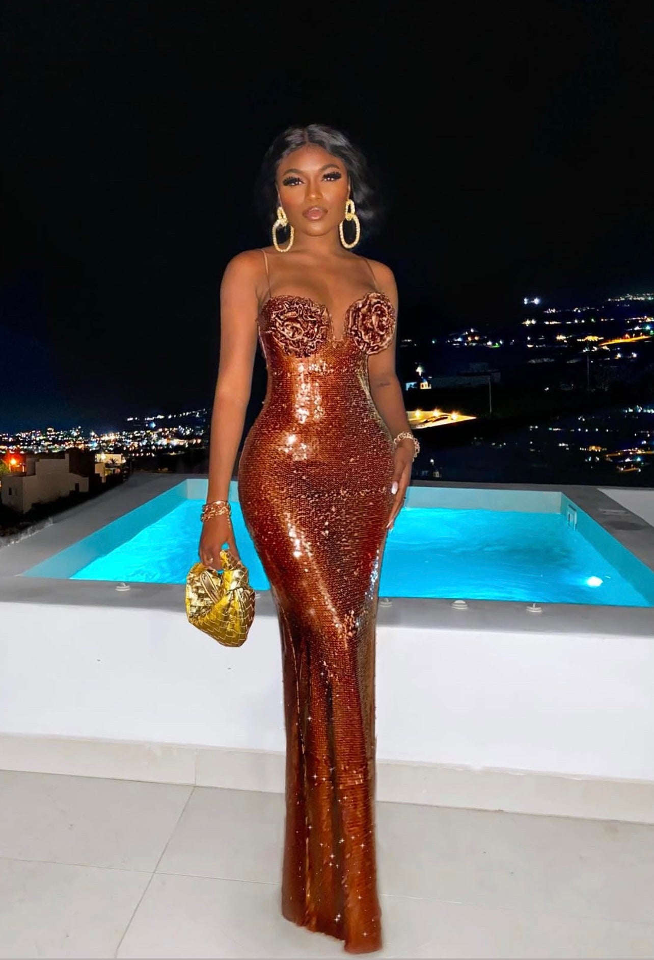 - Product design/details: spaghetti strap string rose design pattern bust sleek sequin special occasion long dress gown